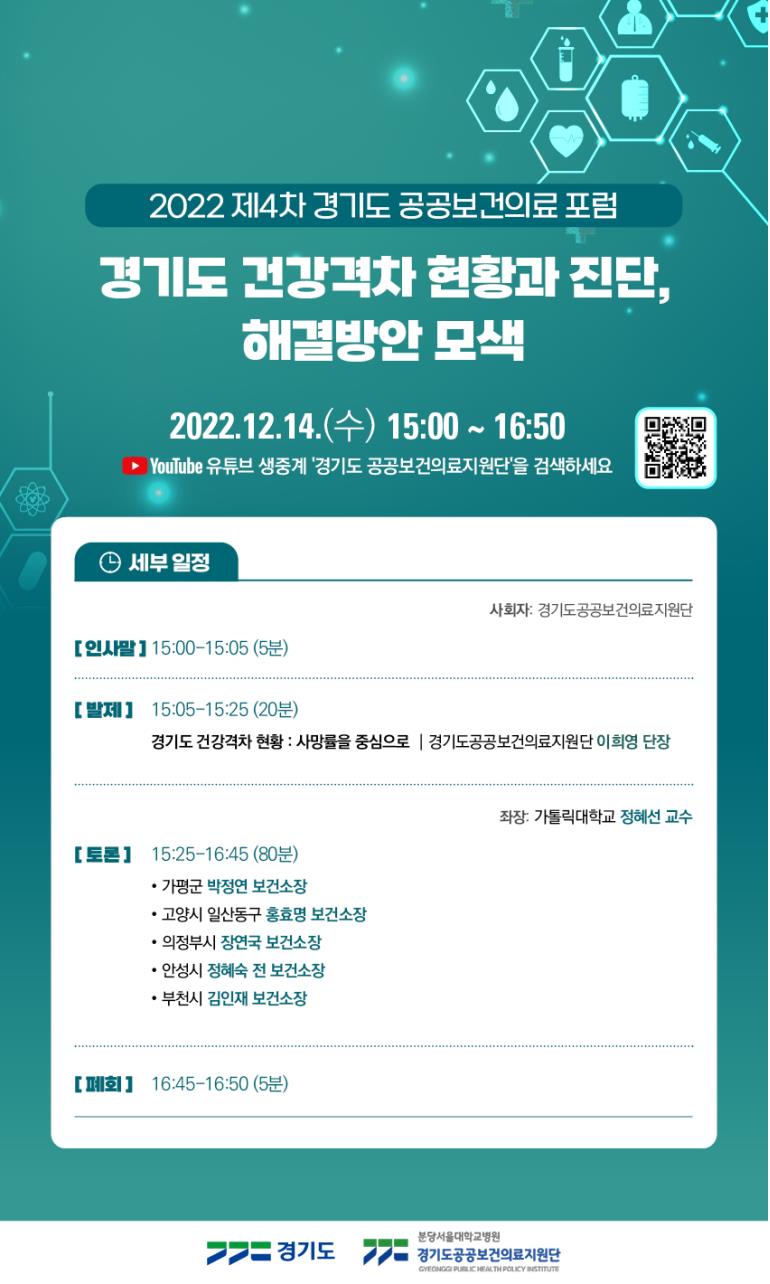 2022년 제4차 경기도 공공보건의료포럼: 「경기도 건강격차 현황과 진단, 해결방안 모색」 개최를 안내드리오니 많은 관심 부탁드립니다. 2022.12.14.(수) 15:00 ~ 16:50 유튜브 생중계 '경기도공공보건의료지원단' 을 검색하세요 | ||