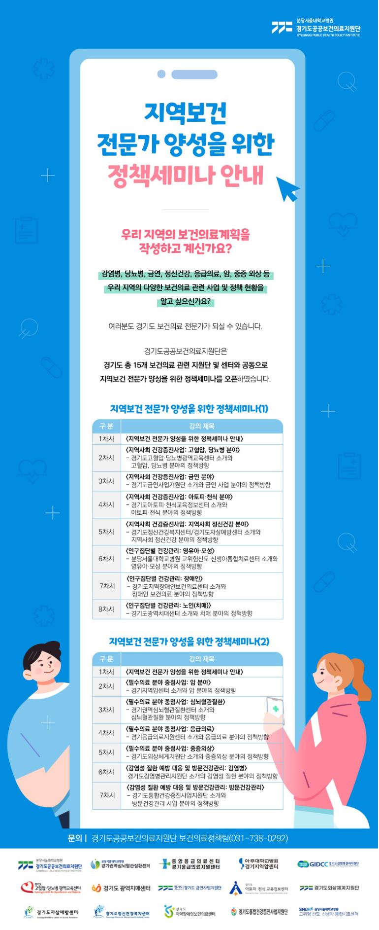 경기도공공보건의료지원단에서는 경기도 및 시군의 제8기 지역보건의료계획(2023~2026) 수립을 지원하기 위하여 도내 보건의료 관련 지원단 및 센터 15개 기관과 공동으로 분야별 지역사회 건강수준, 주요 사업 및 정책 현황에 대한 '지역보건 전문가 양성을 위한 정책세미나'를 개설하였습니다. 본 세미나는 경기도인재개발원 홈페이지(https://edu.gg.go.kr/)에서 2022년 12월 10일부터 12월 24일까지 수강하실 수 있습니다. ※ 세미나 수강기간이 연장되어 2월 13일까지 수강하실 수 있습니다. 많은 관심과 참여 부탁드립니다. ※ 본 세미나는 경기도 및 시군 공무원을 대상으로 진행되는 세미나입니다. -> 경기도인재개발원 홈페이지